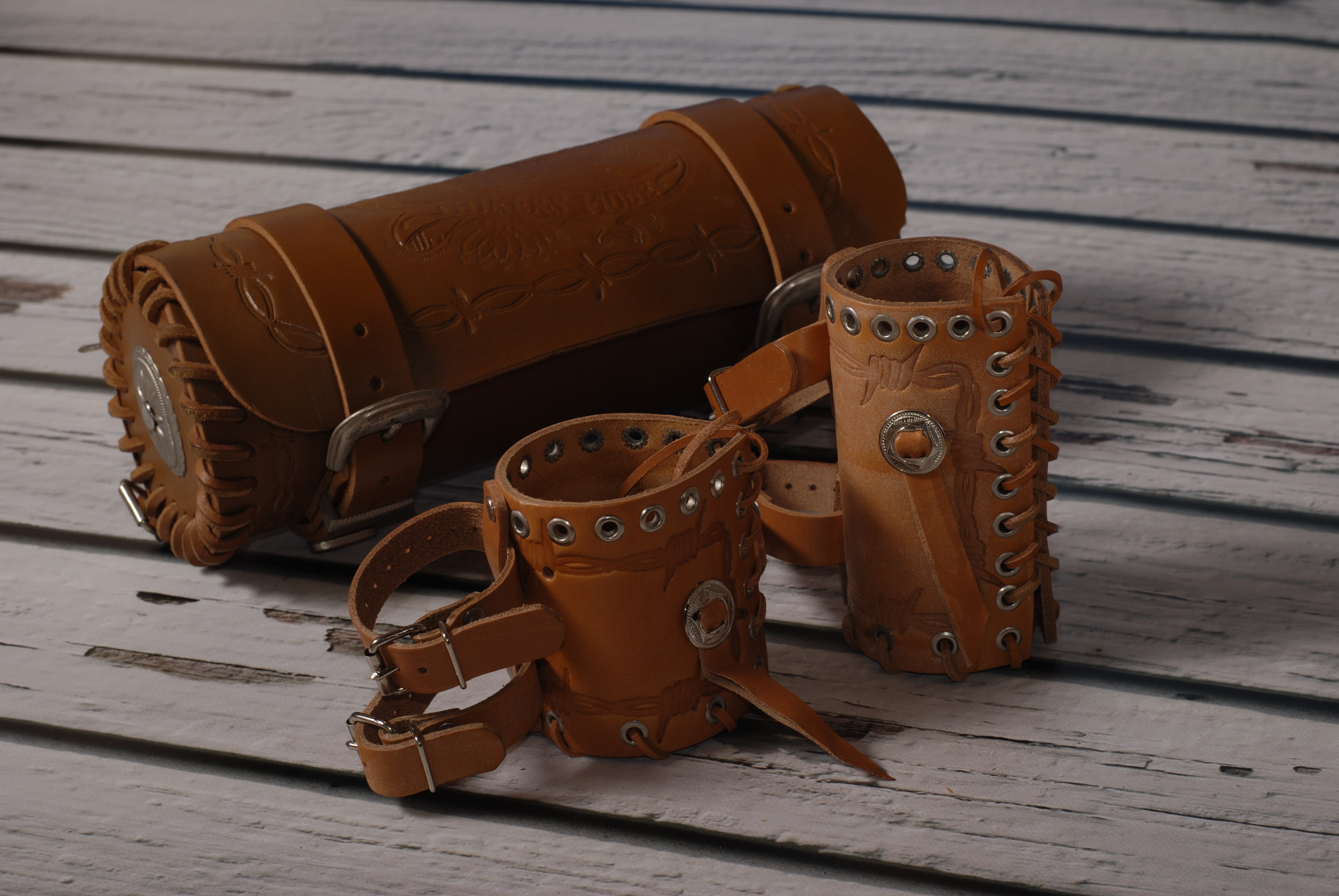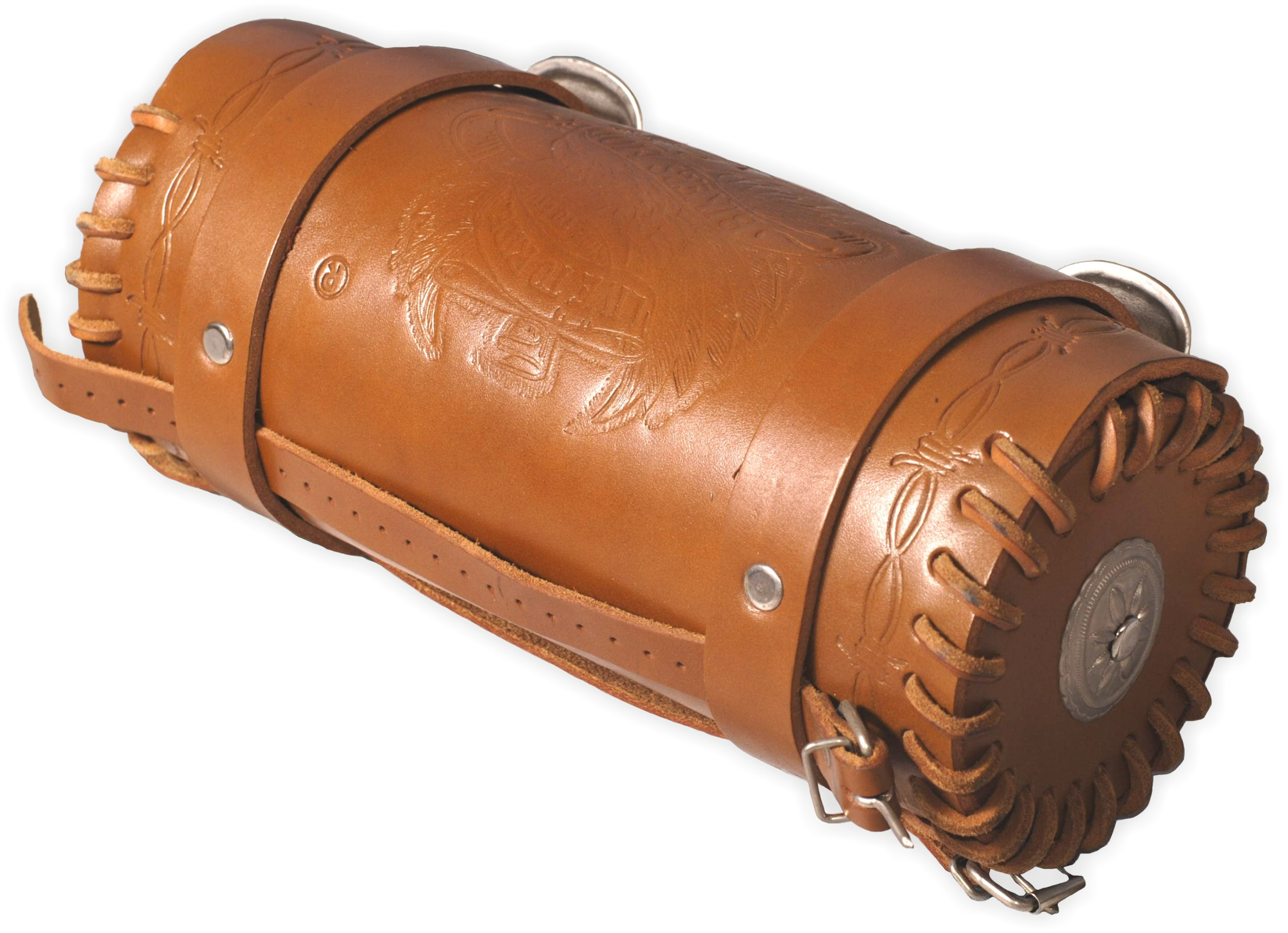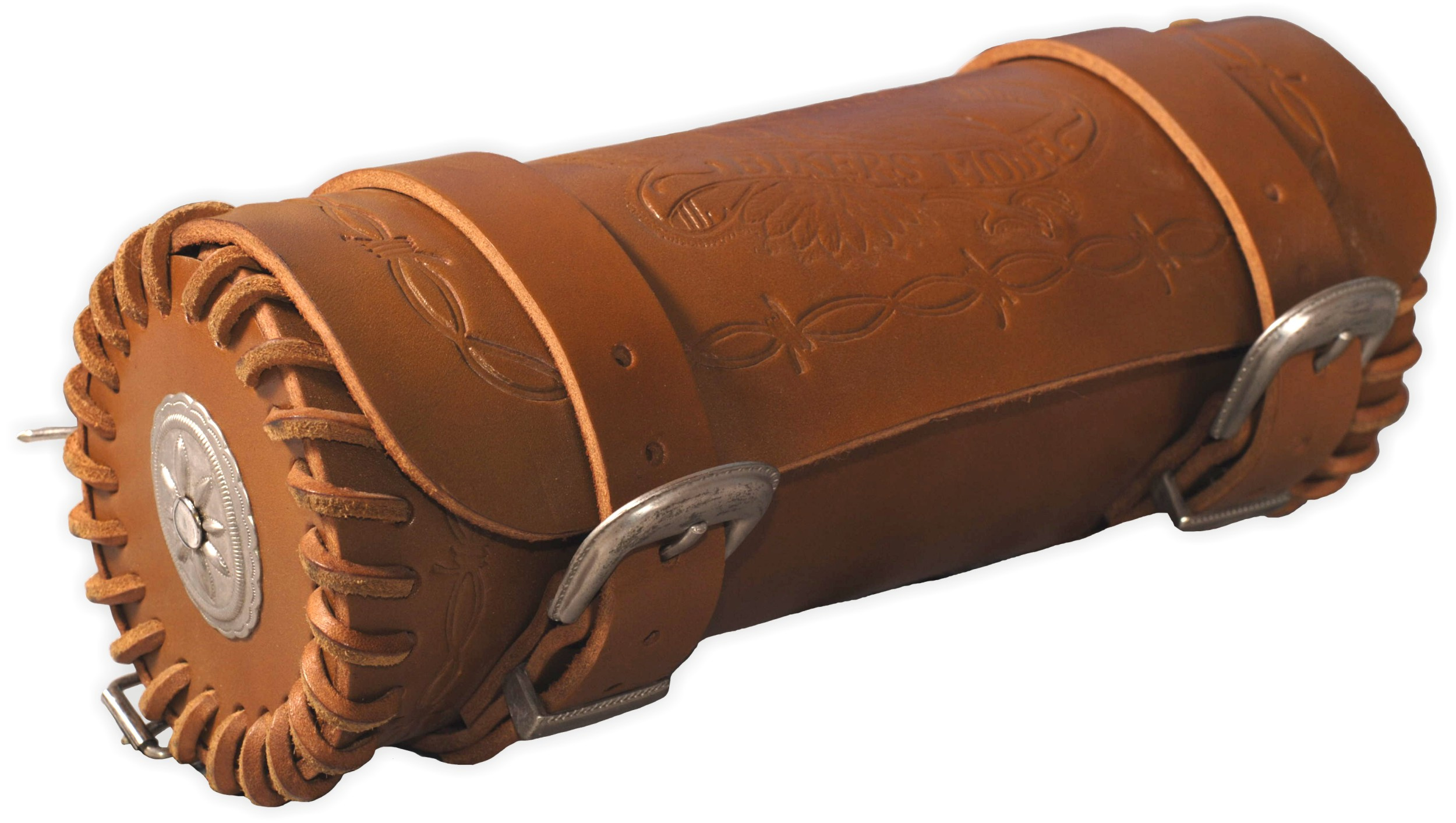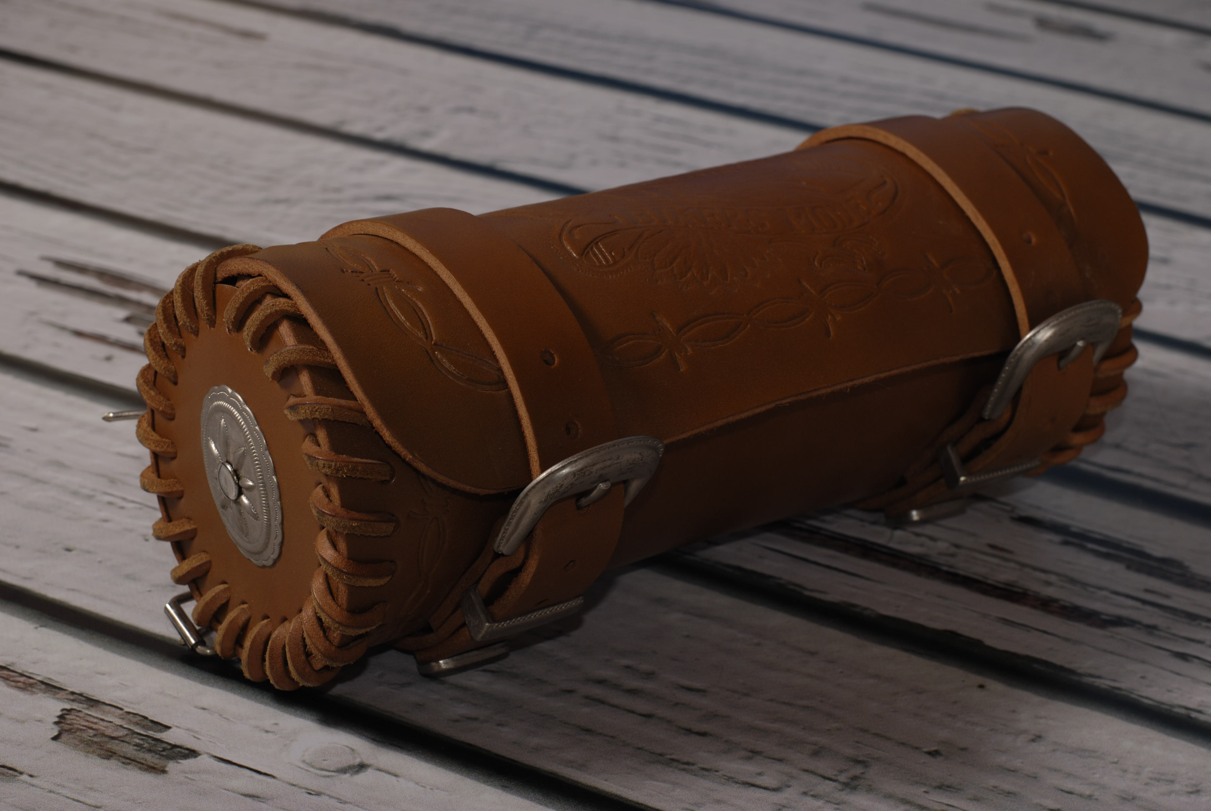 Kožená rolka, válec, se zdobením. Možno upevnit na přední vidlici, opěrku, rám ap. pomocí pásků. Kvalitní kůže a špičkové zpracování.