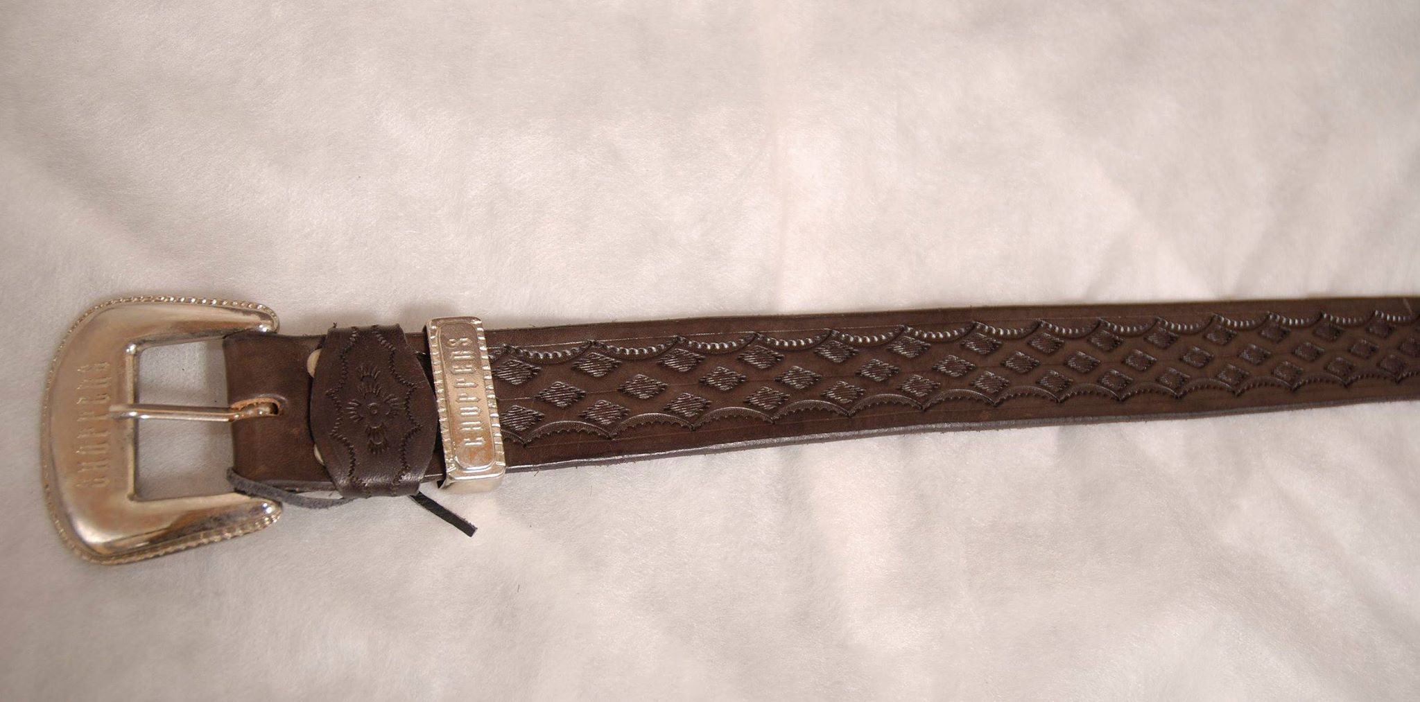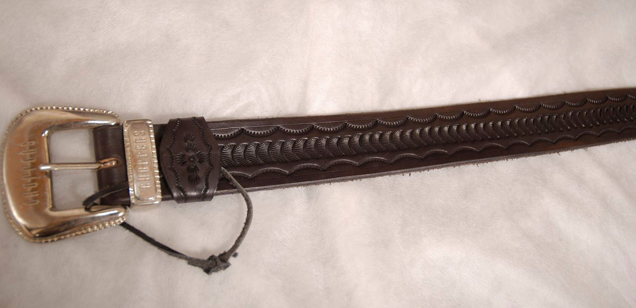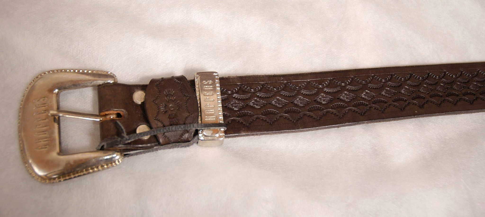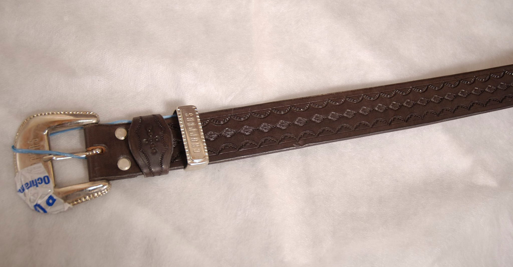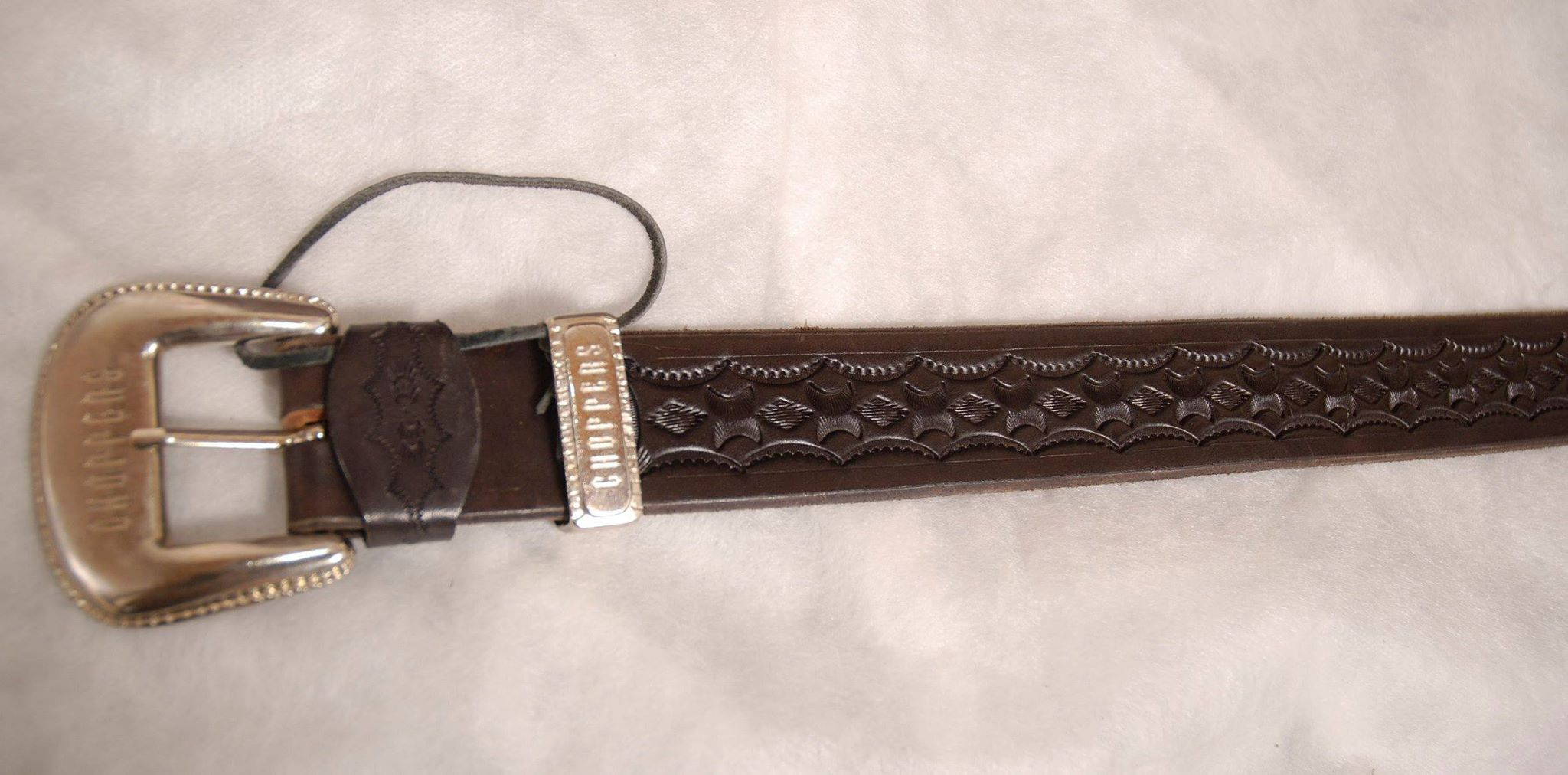 Kožený opasek ručně zdobený - vytlačený vzor (různé vzory), odnímatelná (vyměnitelná) přezka choppers. Délka měřena bez přezky a po prostřední dírku (celková délka opasku plus cca 15 cm).