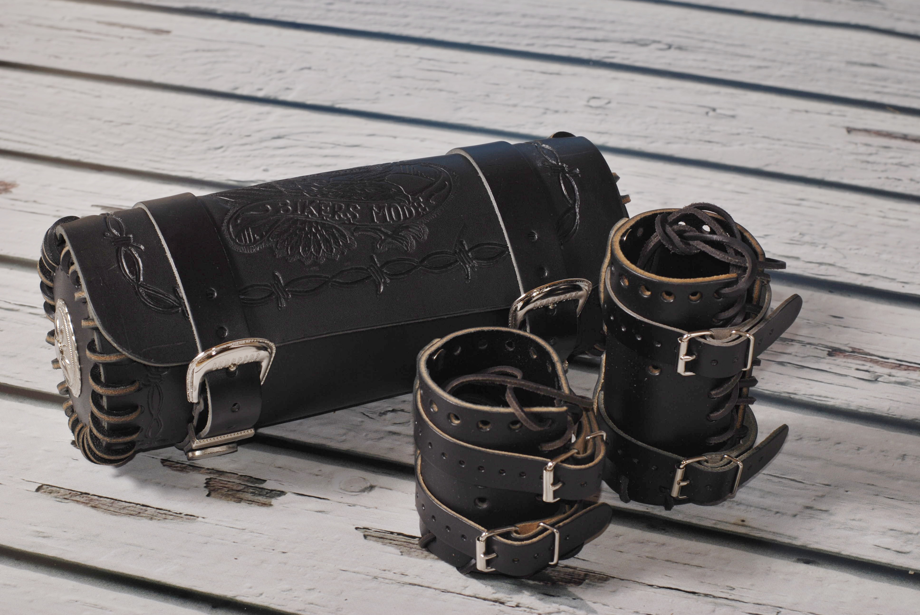 Držák, obal na dohušťovací sprej, plechovku, láhev (vhodný pro vyšší plechovky, 0,3 a 0,5 L láhve) ap. Možno upevnit na řídítka, padací rám, opěrku, přední vidlici ad. pomocí dvou řemínků. Kvalitní kůže a špičkové zpracování.