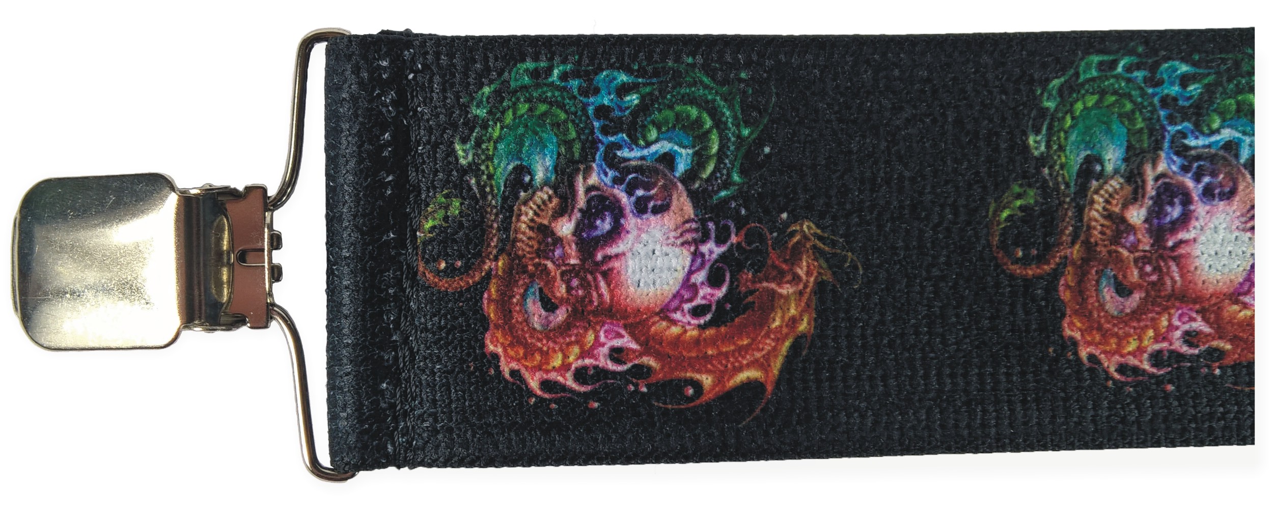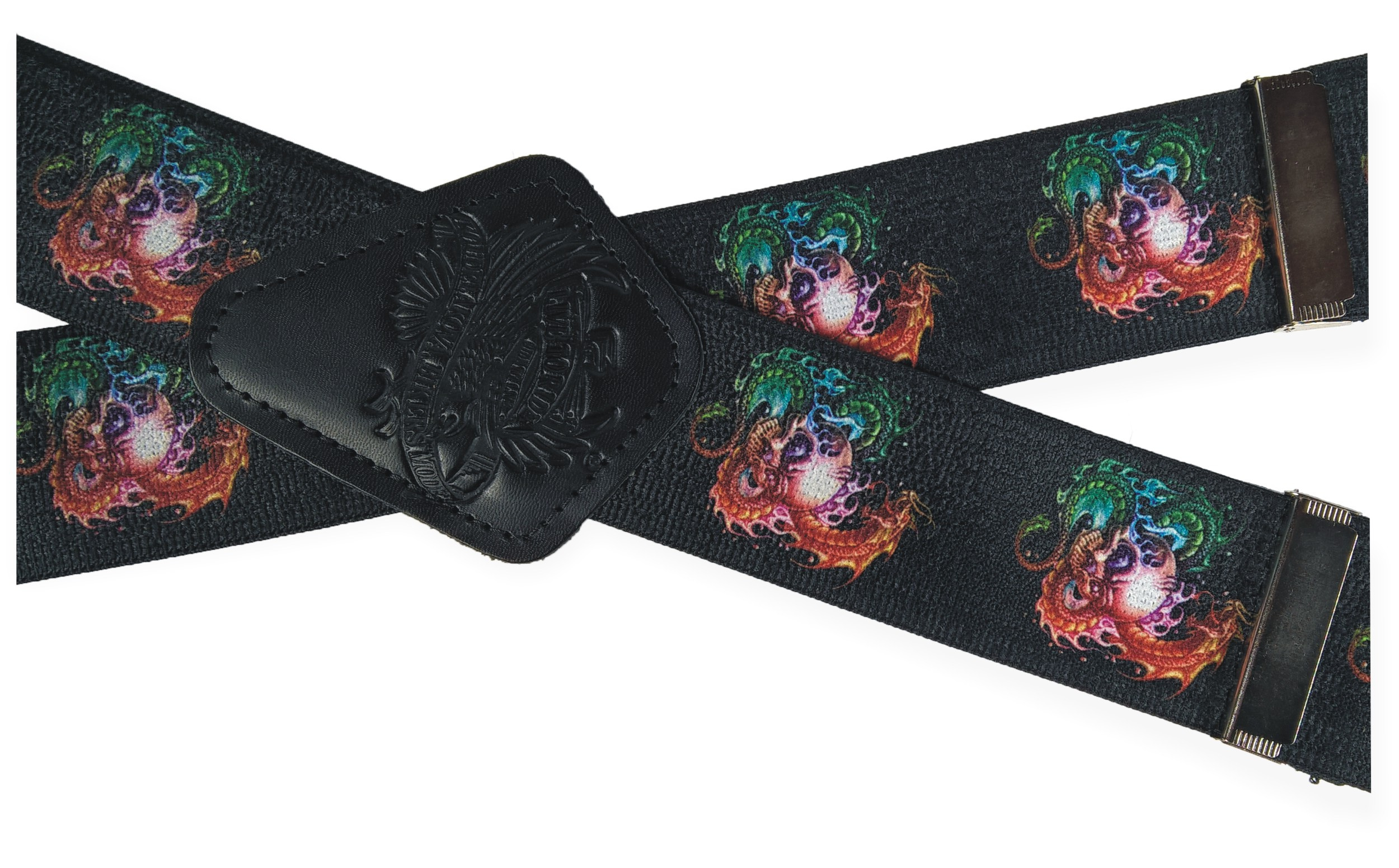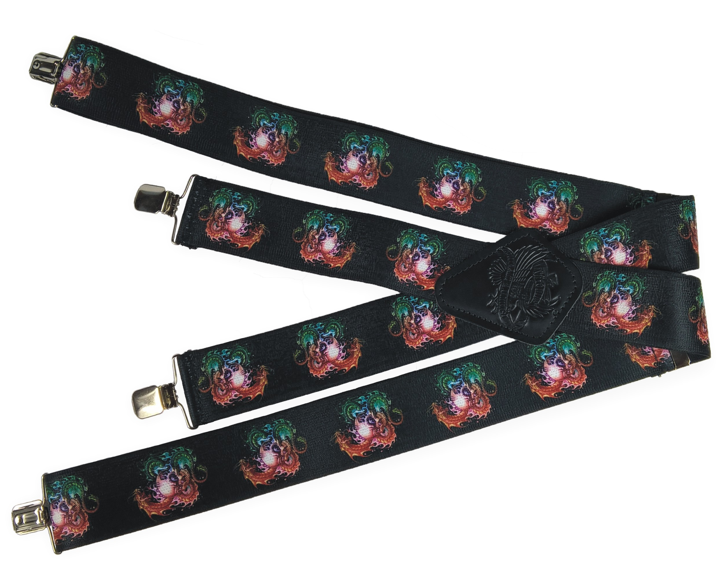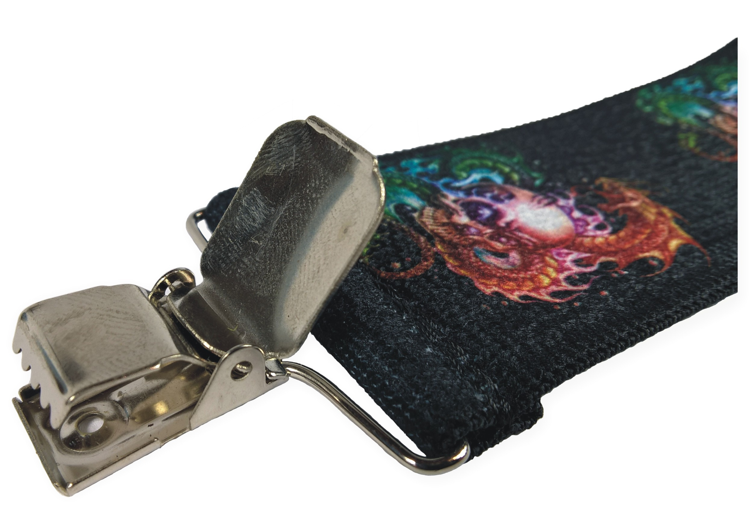 Pružné kšandy s potiskem. Libovolně nastavitelné. Připnutí ke kalhotám je tvořeno kovovými sponkami, které jsou ozubené a tudíž výborně drží a nepovolí.